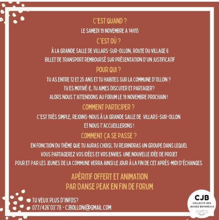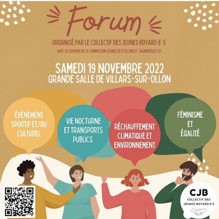 Le Collectif des jeunes Boyard·e·s vous propose une après-midi de réflexion ce samedi 19 novembre à 14h15 à la grande salle de Villars autour de thèmes qui vous sont chers (et à nous autres adultes aussi!) comme le sport et la culture, la vie nocturne et les transports publics, le réchauffement climatique et l’environnement, le féminisme et l’égalité.
