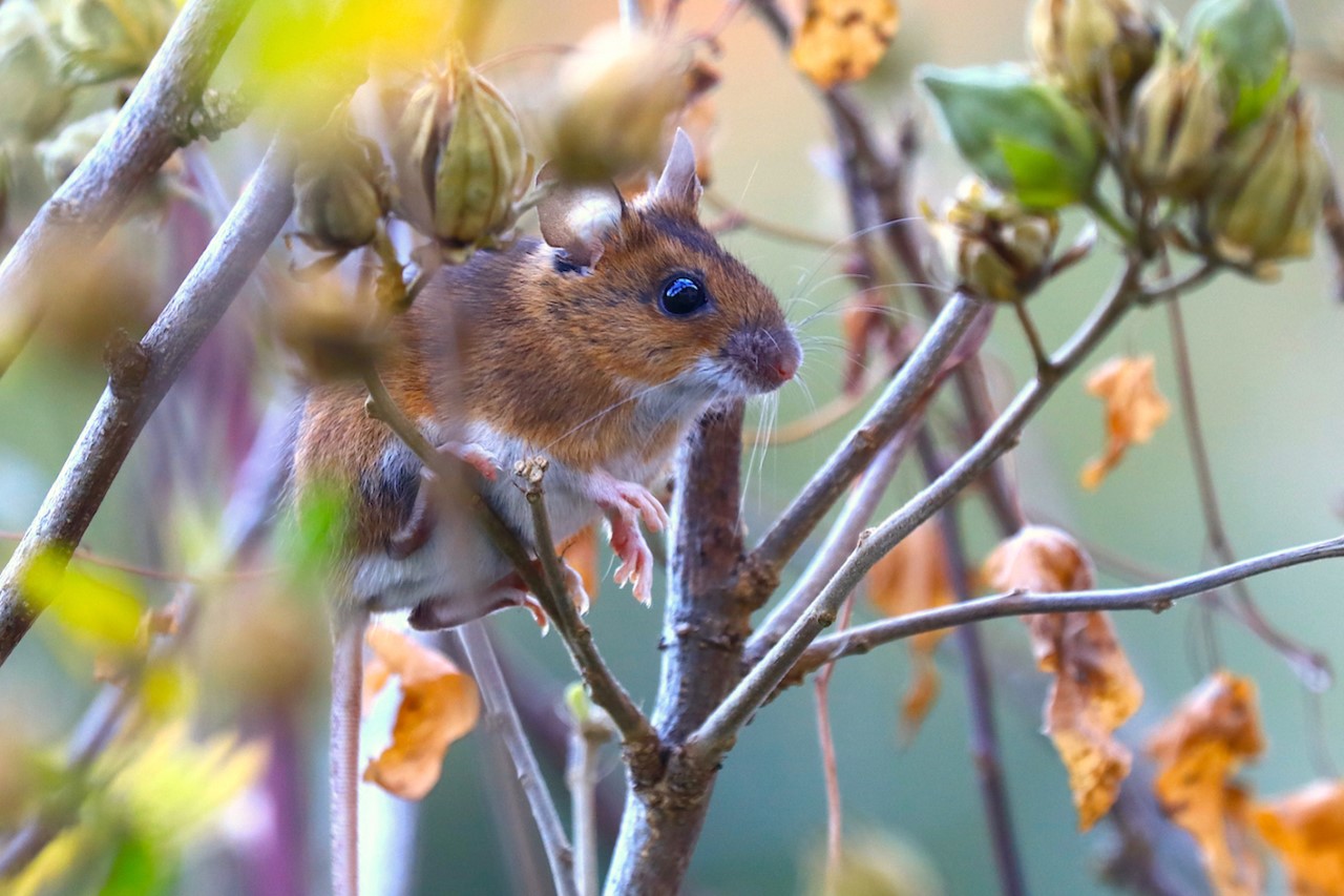 • Première photo et photo en haut à gauche : le mulot à collier se distingue des autres membres de sa famille, comme son nom le désigne, à la bande de poils orangés qui lui barre la poitrine. Une observation pas toujours aisée.