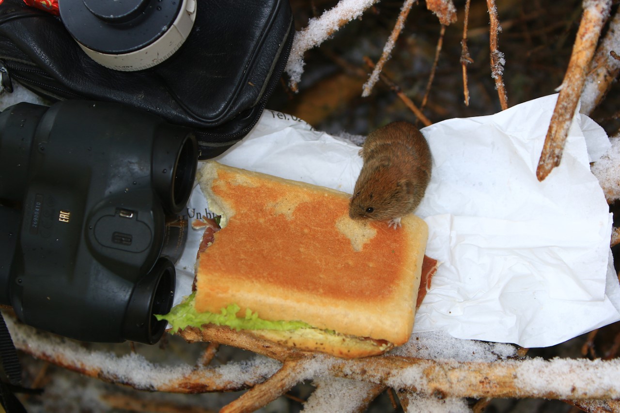Appendices bien visibles, de longues oreilles proéminentes permettent de distinguer aisément la famille des mulots de celle des campagnols dont les oreilles sont pratiquement enfouies dans le pelage. Lors d’affûts photographiques réguliers sur un même site, pour observer une espèce rare ou farouche, il est fréquent que deux espèces de ces familles distinctes s’habituent à ma présence : le mulot à collier et le campagnol roussâtre. Bien davantage que ma personne, ce sont évidemment les restes de mes pique-niques qui les intéressent lors de ces observations qui s’étalent souvent sur des heures. Au fil des jours, ces petits rongeurs réagissent dès mon arrivée pour se montrer de plus en plus audacieux. Ils en arrivent à grimper sur mes chaussures, sur mon sac à dos, quand ils ne s’enhardissent pas à grignoter le sandwich que je viens juste de déposer, mon attention étant attirée par un oiseau ou un grand mammifère. Devenus familiers, ces peluches vivantes se laissent même caresser. De quoi passer le temps de manière amusante et instructive sur le plan éthologique…. surtout lorsque l’animal espéré refuse pour sa part à se montrer.