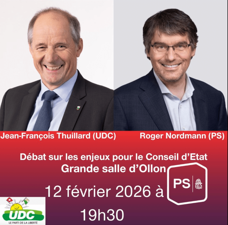 Débat Publié parcatherineflutsch9 février 202610 février 2026Publié dans2026, A vos agendas !, Élections 2026, Élections cantonales, Conseil d'état Ne manquez pas le débat organisée ce jeudi 12 février à 19h30 par le parti socialiste à la Grande salle d’Ollon ! Avec Roger Nordmann (PS) et Jean-François Thuillard (UDC), tous deux candidats à la succession de Rebecca Ruiz au Conseil d’Etat. Partager : Partager sur Facebook(ouvre dans une nouvelle fenêtre) Facebook Partager sur WhatsApp(ouvre dans une nouvelle fenêtre) WhatsApp J’aime chargement… Similaire