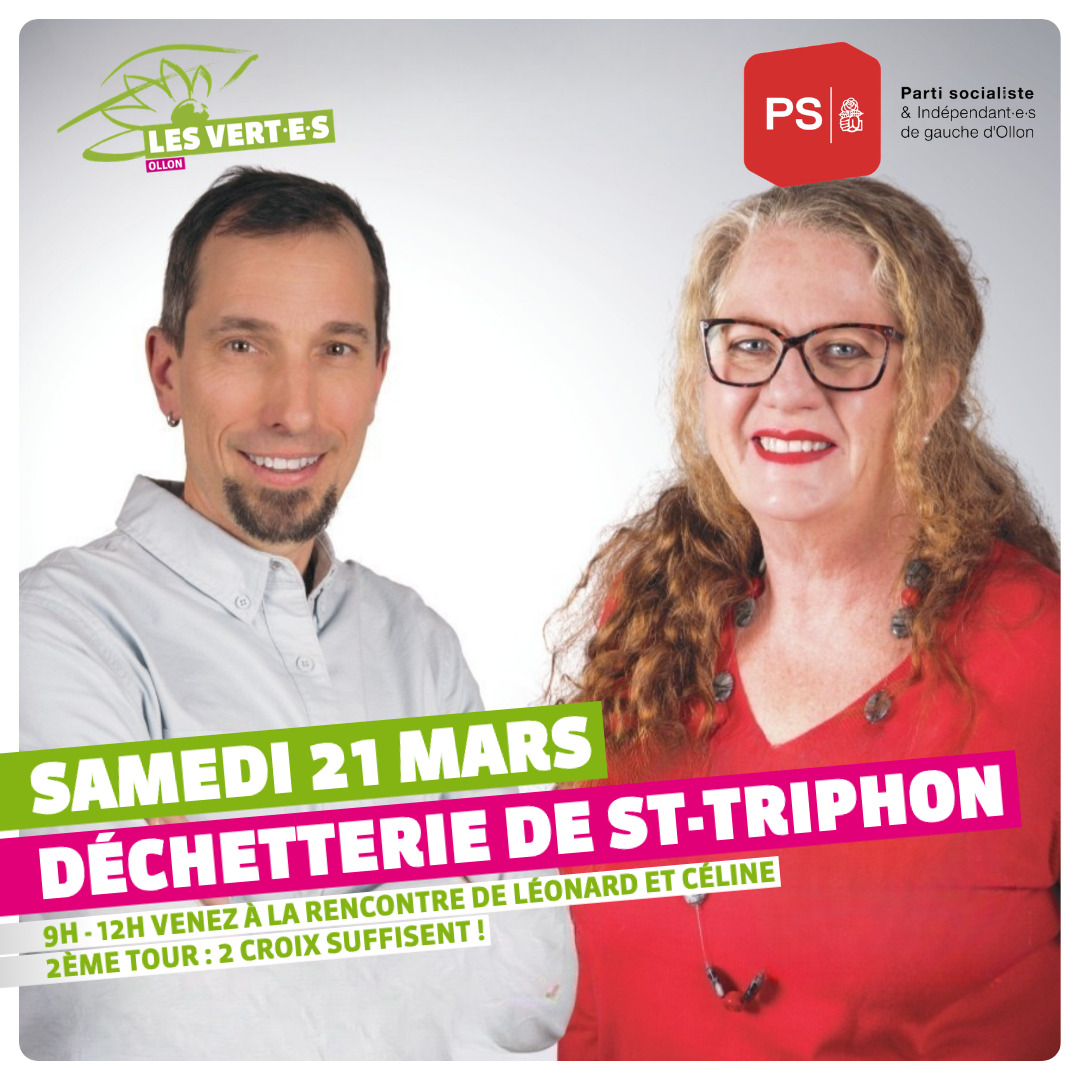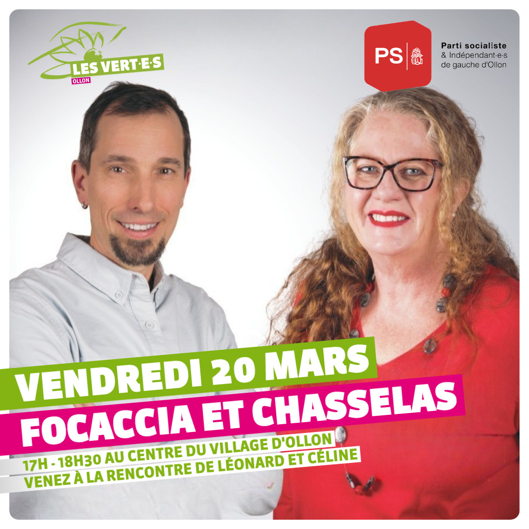 Léonard Farine et Céline Pini viennent à votre rencontre ! Le vendredi 20 mars au centre du Village d’Ollon, ce sera Focaccia et Chasselas de 17h à 18h30 et le samedi 21 mars, nos candidats seront à la déchetterie de St-Triphon de 9h à 12h.