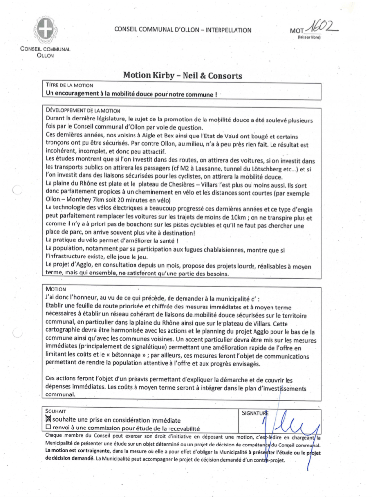Motion «Un encouragement à la mobilité douce pour notre commune !» Motion déposée le 7 octobre 2016 par Neil Kirby. En cours de traitement par la Municipalité. TEXTE motion-kirby-mobilitecc81-douceTélécharger Partager : Partager sur Facebook(ouvre dans une nouvelle fenêtre) Facebook Partager sur WhatsApp(ouvre dans une nouvelle fenêtre) WhatsApp J’aime chargement…